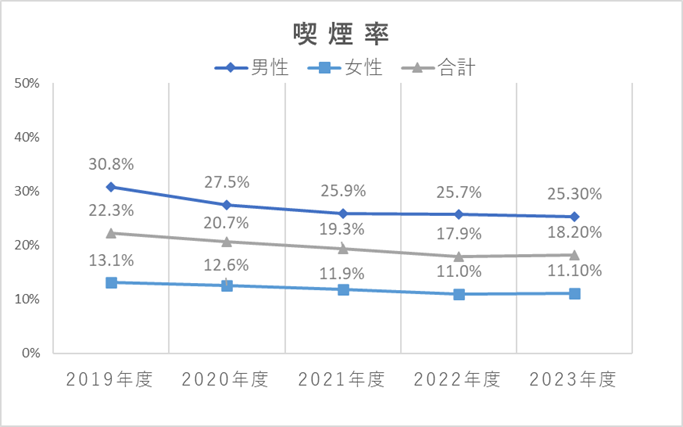 また、社員の禁煙サポートにも力を入れており、2018年度から健康保険組合とのコラボヘルス事業として、オンライン禁煙プログラムを継続して提供しています。2023年度に2019年度比で男性喫煙率6.8%減少、女性喫煙率6.1%減少を目標に掲げて取り組んでおり、喫煙率は年々減少傾向です。